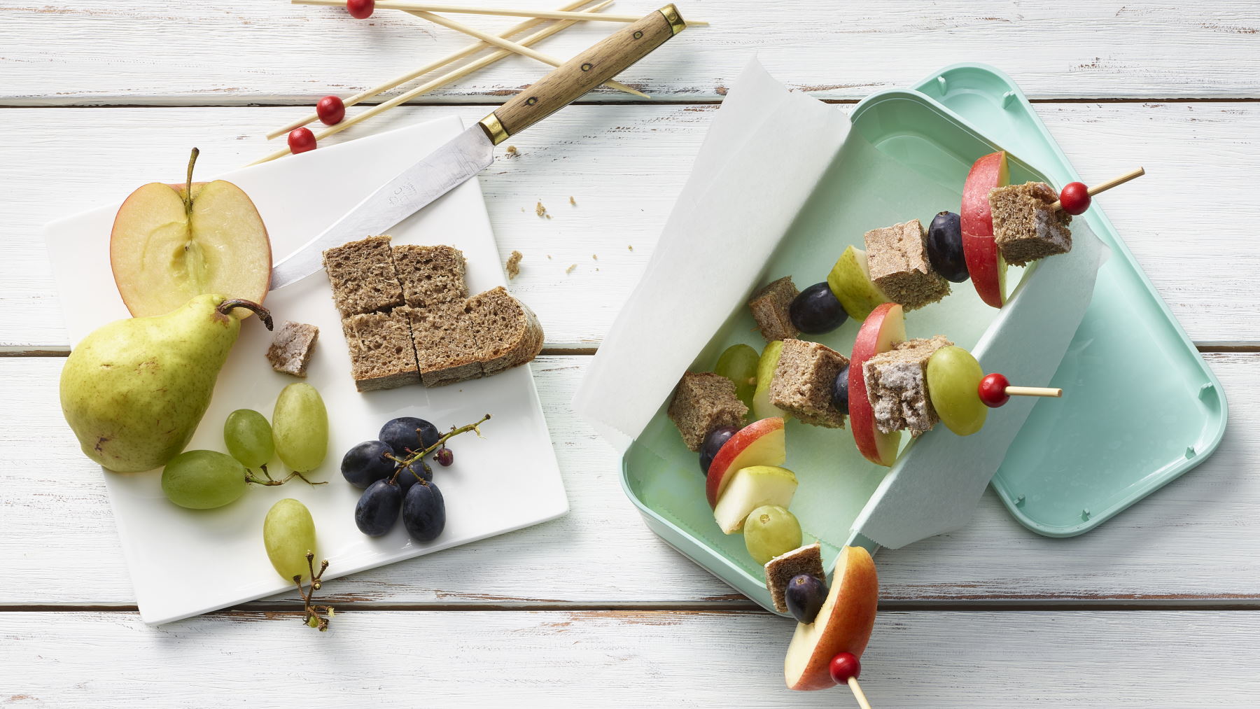 Brot und Früchte als frischer Pausensnack. Frisch serviert lassen sich die Brot-Früchte-Spiesschen mit einem Joghurt- oder Quark-Dip kombinieren.